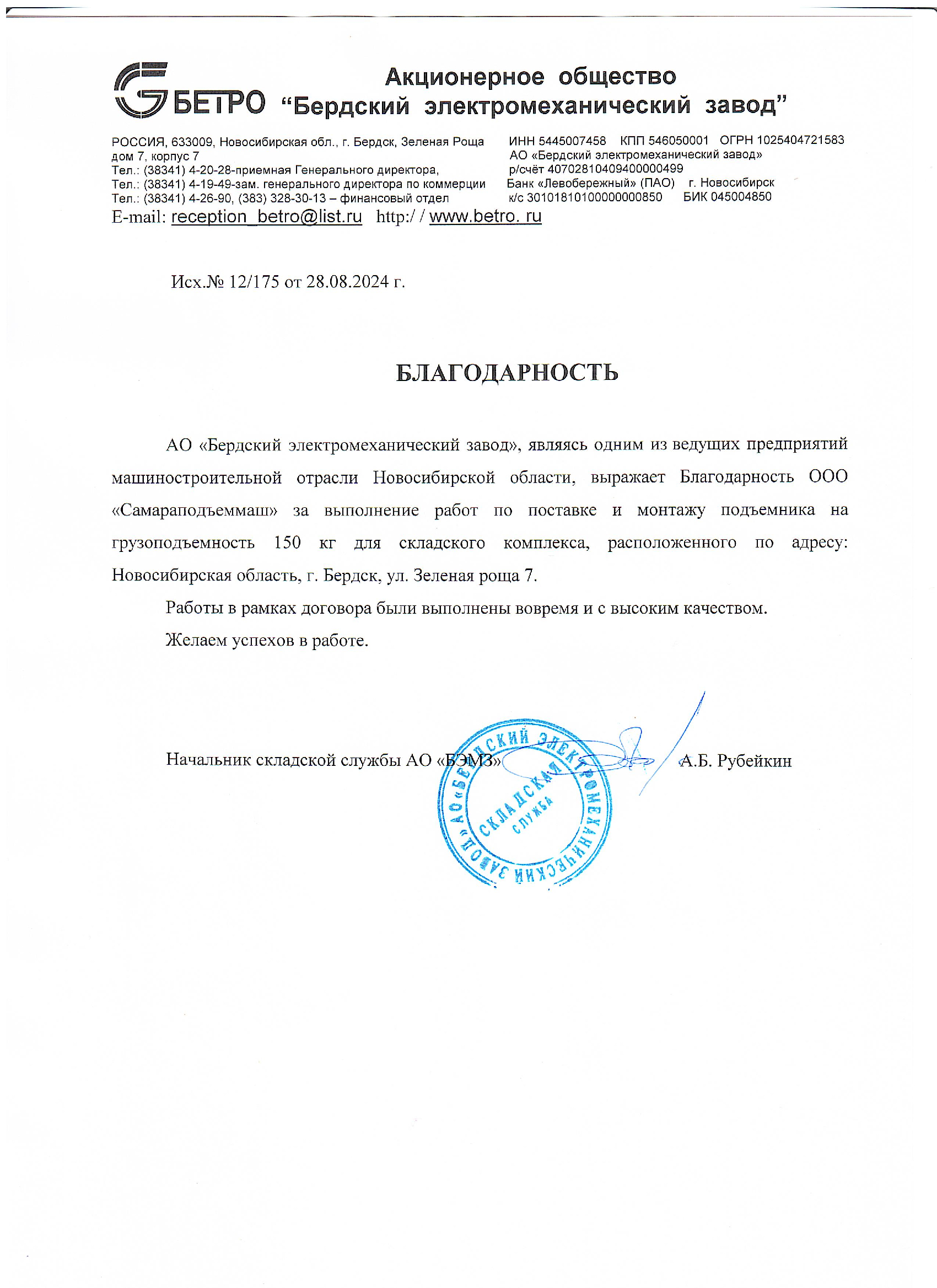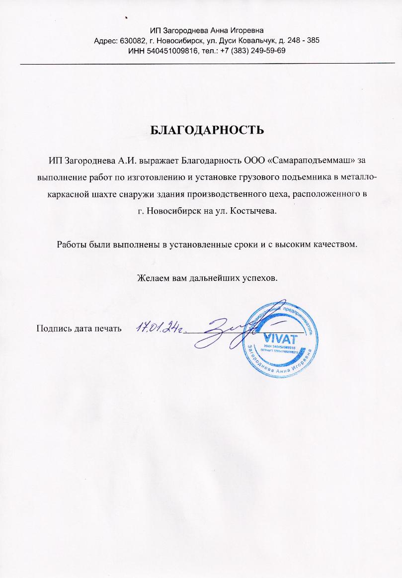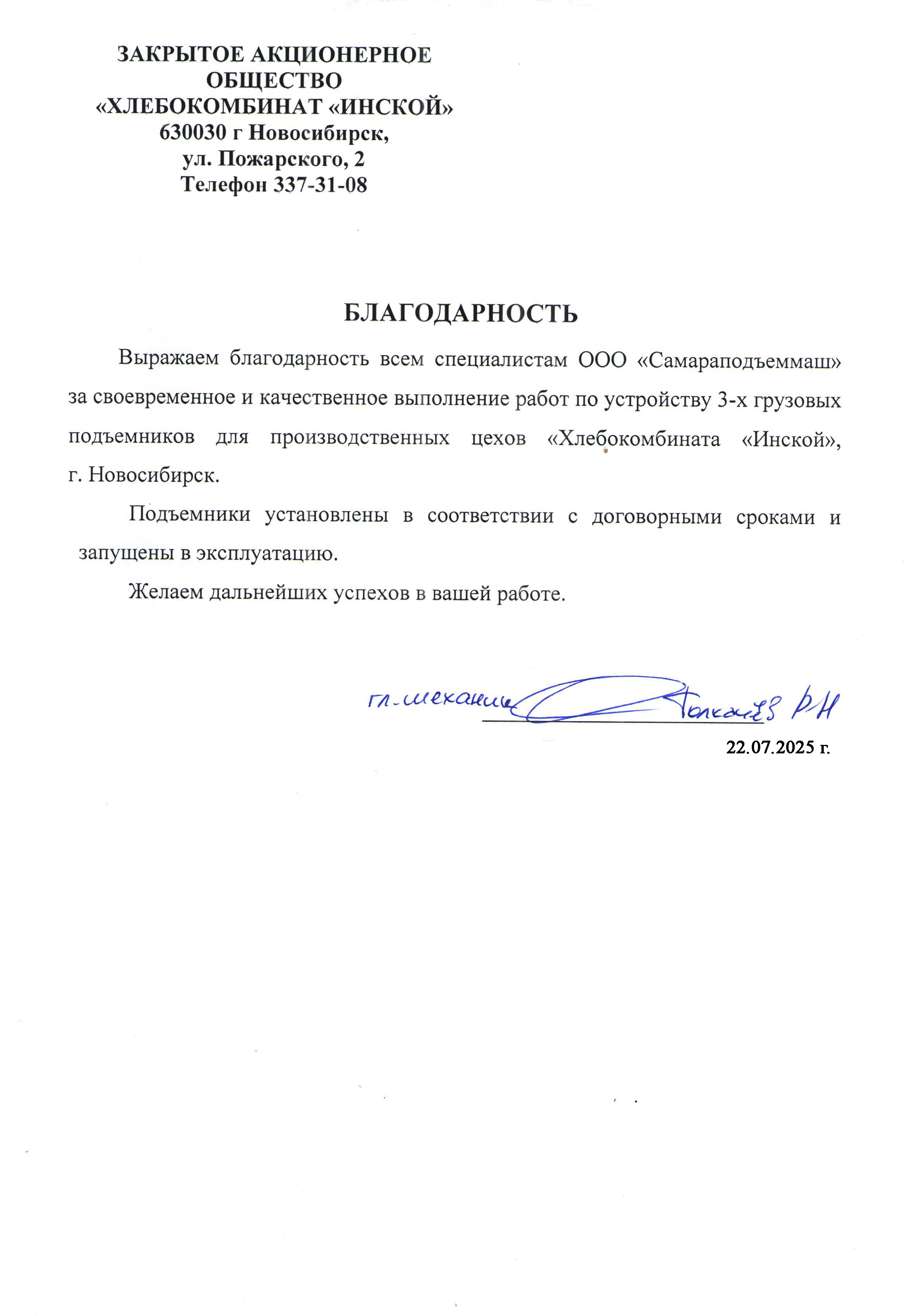 Выражаем благодарность всем специалистам ООО «СПМ» за своевременное и качественное выполнение работ по устройству 3-х грузовых подъемников для производственных цехов «Хлебокомбината «Инской», г. Новосибирск.